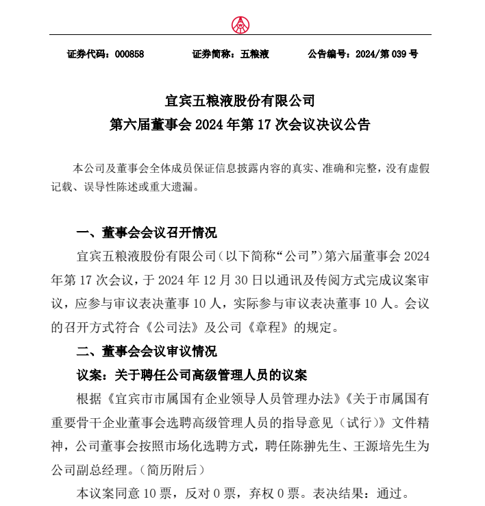 12月30日,宜賓五糧液股份有限公司(簡(jiǎn)稱五糧液)發(fā)布公告,聘任陳翀、王源培為公司副總經(jīng)理。據(jù)悉,二人今年分別45歲和37歲,是當(dāng)前五糧液高管團(tuán)隊(duì)中最為年輕的兩···