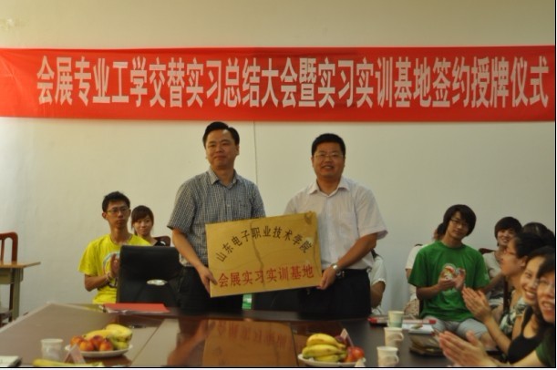 2012年6月26日下午,中貿(mào)國際與山東電子職業(yè)技術學院舉辦了會展策劃與管理專業(yè)“工學交替”實習總結(jié)大會暨校外實習基地簽約授牌儀式。山東省會展業(yè)協(xié)會常務副秘書長燕飛、山東中貿(mào)國際經(jīng)濟貿(mào)易推廣服務中心主任杜磊及三位項目經(jīng)理應邀出席,山東電子職業(yè)技術學院王協(xié)瑞副院長、管理系梁會亭主任及部分教師、輔導員和會展專業(yè)學生參加了此次會議。